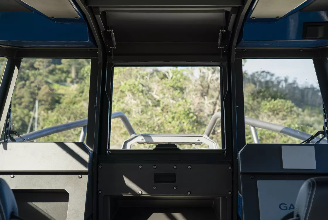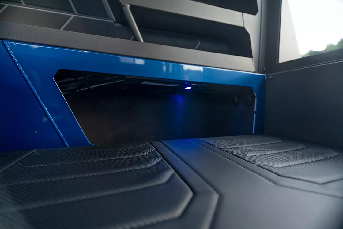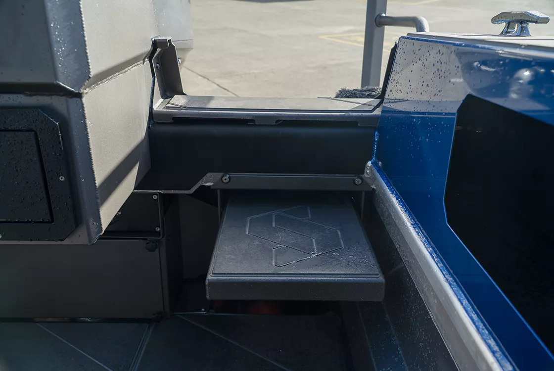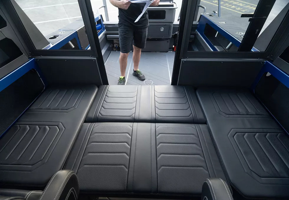The 2350 Ultracab™ WT features improved interior appointments with a range of furniture options tailored to different usage needs. The default seating is now blade-style, which frees up ample space for additional cargo. Both front seats can be upgraded to heavy-duty mechanical suspension for enhanced comfort. For those seeking overnighting conveniences, the new folding table with port-side saloon seating sits over a cabinet-style fridge, while the starboard side can be converted into a galley with a sink and freshwater supply over a 12V oven. The sleeper seat box options have also been upgraded, with available fridge and electric oven options. Additionally, a rear-facing storage seat option is available—a modern take on the King/Queen configuration—providing a comfortable spot to watch your lures for action.