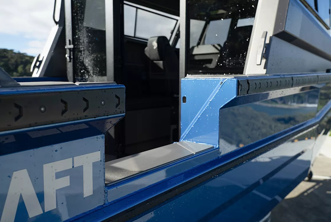 he 2350 Ultracab™ WT offers an extensive range of fish deck setup options to suit your fishing style, regardless of the species you intend to target. Choose between two rear wall configurations: a fully opening bifold door or a single-door sealed bulkhead. For example, this could allow you to tailor the boat for cold-climate salmon trolling with an aft helm station or for warm-climate fishing with the doors wide open. Additional options include downrigger or electric reel plugs integrated into the coamings, along with the full selection of 2350 transom configurations—as found in the Supercab and Ultra Centrecab—including transom cages.
